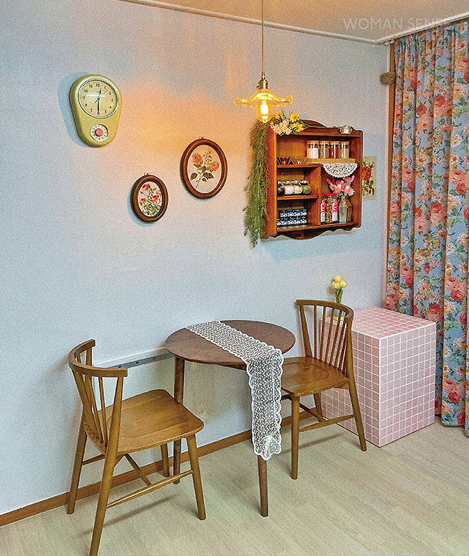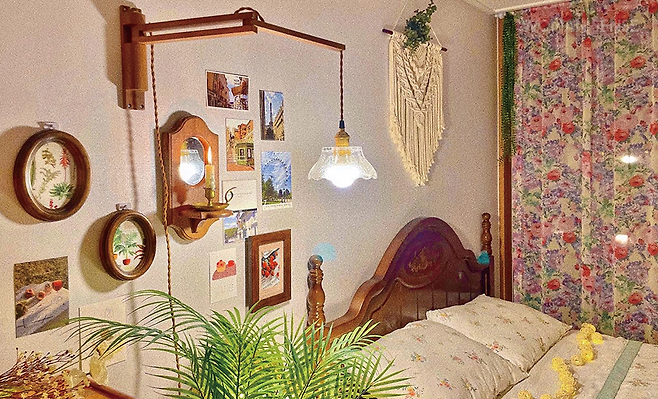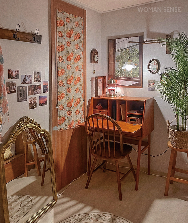 관사라서 공사를 할 수는 없어 가구와 소품으로 빈티지한 분위기를 내려고 노력했어요. 특히 색이 짙은 원목 가구가 빈티지한 분위기를 살려줬어요. 곳곳에 식물로 생기 있는 분위기를 더하고, 벽에는 액자와 포스터로 포인트를 줬습니다. 빈티지한 분위기는 처음부터 모든 것을 완성하는 것이 아니라 조금씩 작은 것들로 채워나갈 때 더 매력 있는 것 같아요.