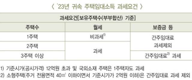 어쨋든 여기서 과세 대상은 임대 주택의 수가 아닌 소유 주택의 수를 의미한다는 데 주의가 필요합니다. 가령 주택 두 채 소유한 A씨가 한 채를 월세를 줬다면 2주택자의 과세가 적용되는 것이죠. 또 1주택 소유자라도 자신은 전세 살면서 소유 주택을 월세(12억 초과 고가 주택)로 준다면 임대소득세를 내야 하는 것입니다. 2026년부터 고가주택 소유자는 2주택자도 전세(간주임대료)에 대해 소득세가 과세된다는 점도 미리 알아두셔야 합니다.