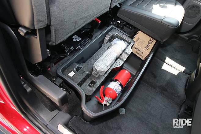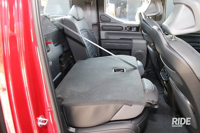 기자의 키가 196cm라 일반적인 차들은 정자세로 앉으면 머리가 천장에 닿는 경우가 일상다반사다. 타스만 역시 마찬가지지만 이 차에는 대안이 있다. 바로 리클라이닝 연동 슬라이딩 시트 기능으로, 쉽게 말해 시트를 앞으로 당기면 등받이가 기울고, 반대로 시트를 뒤로 밀면 등받이가 꼿꼿이 서게 된다. 거의 모든 픽업트럭은 등받이가 고정되어 뒷좌석에 탄 사람은 강제로 허리를 세운 채로 타야 해 장시간 이동에선 불편함이 있지만, 타스만은 레그룸을 조금 줄이면 머리 닿을 일 없이 편한 자세로 탈 수 있어 좋다. 뒷좌석 등받이 중앙을 내리면 컵홀더가 더해진 팔걸이가 나와 장거리 이동이 조금 더 편해진다.