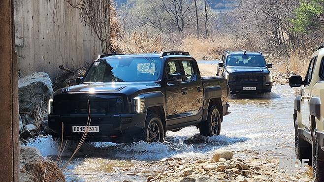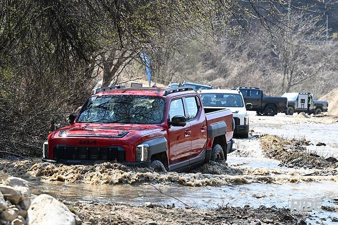 다음은 오프로드 체험이다. 앞선 임도 체험 때와 마찬가지로 오프로드에 특화된 엑스프로 사양이 준비되어 오프로드 체험장으로 향했다. 얼마 전 렉서스 LX 시승 때도 방문했던 곳이지만, 새롭게 코스를 정비해 완전히 다른 모습이다. 코스에 들어서 가장 먼저 도강 체험에 나섰는데, 일반 SUV라면 흡기구로 물이 들어올만한 깊이지만 타스만은 최대 800mm 깊이까지 건널 수 있도록 설계되어 있어 걱정할 필요가 없다. 여러 설계 중 하나가 흡기구 배치로, 일반적으로 자동차는 앞쪽으로 흡기구를 배치하지만 타스만은 흡기구를 왼쪽 펜더 쪽에 후방을 향하도록 배치하고 위로 커버를 더해 앞쪽에서 유입되는 건 물론이고, 빠르게 물에 진입해 위에서 물이 쏟아지더라도 흡기구로는 물이 유입되지 않게 설계해 걱정하지 않고 앞으로 쭉쭉 나아간다.