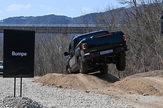 다음으로 범피 구간이다. 여기서는 드디어 e-LD 기능을 사용하게 된다. 한쪽 바퀴가 뜨는 상황에서도 차동장치가 잠겨 양 바퀴가 똑같이 돌아가기 때문에 장애물을 문제 없이 타넘을 수 있다. 가속 페달로 속도를 조절해도 되지만 자신 없다면 엑스트렉 모드로 일정 속도를 유지하게 설정해놓고 조향에만 집중하는 방법도 있다.