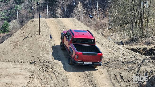 다음으로는 모굴 코스다. 짧은 언덕이 이어지는데 좌우 언덕이 엇갈리도록 설계되어 한쪽 바퀴가 뜨게끔 설계된 오프로드 성능 테스트에서 빠질 수 없는 단골 코스다. 보통 여기서 차동장치 잠금(디퍼렌셜 락) 기능을 확인하는 용도로 쓰이는데, 이번에는 별다른 설정 없이 그냥 들어간다. 이유는 트랙션 컨트롤 기능만으로도 충분히 돌파할 수 있기 때문이라고. 인스트럭터의 설명에 따라 주행모드를 4L로만 바꾼 채로 천천히 코스에 진입했는데 별 어려움 없이 가볍게 통과하는 모습에 그저 놀랄 따름이다.