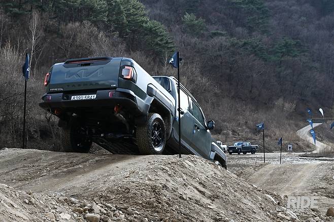 마지막 구간도 오프로드 체험의 단골 코스인 사면 주행으로, 평소 도로에서 종방향 경사가 아닌 횡방향 경사를 주행한다. 타스만은 최대 35도의 경사로를 통과할 수 있는데 이날 코스는 30도 수준으로 최대 허용치보다 낮지만 평소 이렇게 기울어진 곳을 갈 일이 없다보니 코스에 진입하는 순간부터 등골이 오싹해진다. 분명 여러 번 경험했고 충분히 통과할 수 있는 성능을 갖췄음을 알지만 이성보다 본능이 앞서는지 불안감이 드는 것. 그래도 차가 뒤집어지는 일 없이 통과하는 것을 끝으로 마련된 오프로드 코스 체험을 모두 마쳤다.