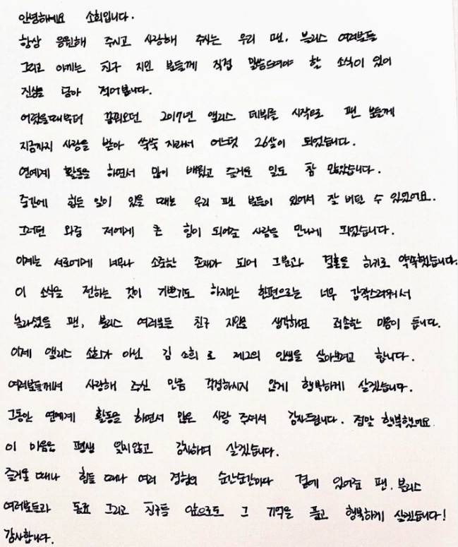 소희는 26일 자신의 SNS에 손편지로 결혼 소식을 전했다.