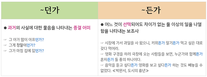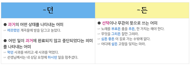 '던'과 '든'을 알기쉽게 정리하면 '~던'은 과거의 어떤 상태를 나타날 때 많이 쓰입니다(회상). '~든'은 나열된 동작이나 상태, 대상들 중에서 어느 것이든 선택될 수 있음을 나타내는 경우에 쓰입니다(선택). 예문으로 알아볼까요?