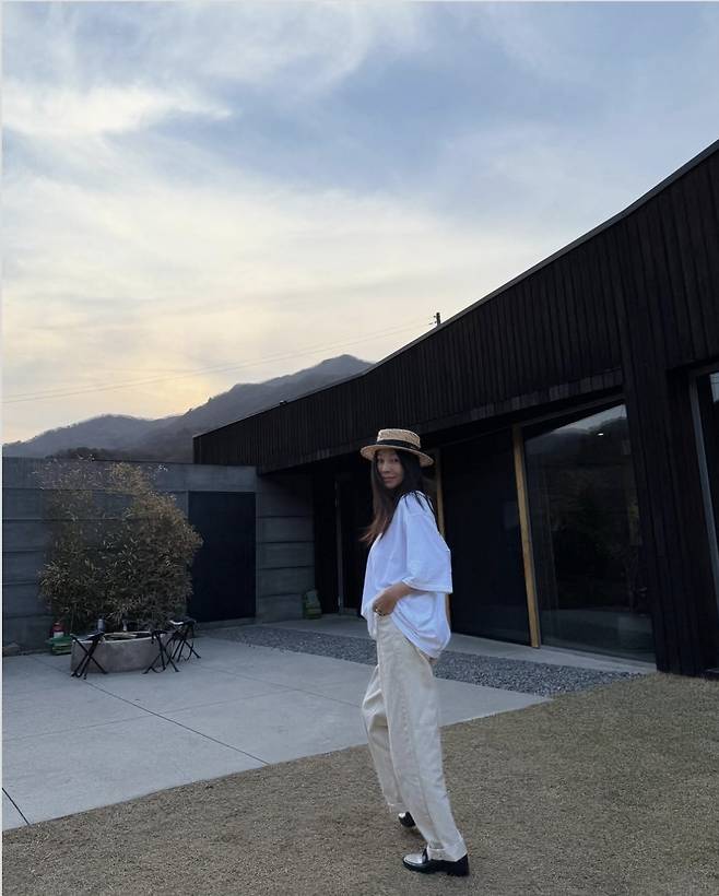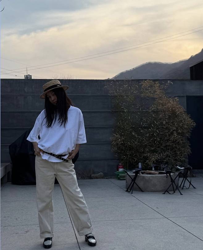 황신혜는 루즈한 핏의 화이트 반팔 티셔츠에 크림 컬러의 와이드 팬츠를 매치해 편안하면서도 스타일리시한 일상룩을 완성했습니다.