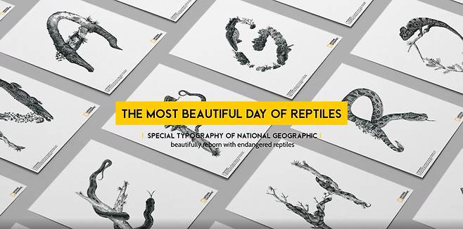 다음 소개해 드릴 수상작은 클리오 어워드에서 은상을 수상한 ‘The Most Beautiful Day of Reptiles’입니다. 파충류에 대한 인식을 개선하기 위해 낸 아이디어인데요, 아름다운 파충류 삽화를 타이포그래픽으로 만들어 환경 파괴로 인한 멸종위기의 파충류에 대한 경각심을 전달하게 됩니다. 내셔널지오그래픽에서 실제로 채택하여 2019 내셔널지오그래픽 10월호 커버에 선정됩니다.