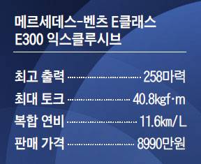 시승 모델인 E300 익스클루시브의 파워트레인은 2.0L 4기통 가솔린 터보 엔진과 9단 변속기를 조합한다. 48V 마일드 하이브리드 시스템이 최대 17㎾의 힘을 더한다. 최고 출력 258마력, 최대 토크 40.8㎏f·m를 발휘한다. 정지 상태에서 시속 100㎞까지 6.1초 만에 가속하며, 사륜구동으로 네 바퀴에 동력을 전달한다. 복합 연비는 11.6㎞/L다.