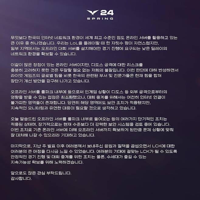 이 사무총장은 "많은 장점이 있는 온라인 서버지만, 디도스 공격에 대한 리스크를 충분히 고려하지 못한 것은 두말할 필요 없는 저희의 불찰이다"라며 "이런 판단에 대해 반성하면서 라이엇 게임즈의 글로벌 팀을 비롯 한국의 관련된 부서 및 전문가들은 현재 힘을 합쳐 장단기 개선 방안을 강구해 나가고 있다"고 강조했다.