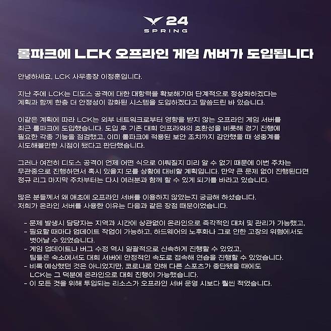 LCK 이정훈 사무총장은 13일 "LCK는 외부 네트워크로부터 영향을 받지 않는 오프라인 게임 서버를 최근 롤파크에 도입했다"라며 "도입 후 기존 대회 인프라와의 호환성을 비롯해 경기 진행에 필요한 각종 기능을 점검했고, 이미 롤파크에 적용된 보안 조치까지 고려했을 때 생중계를 시도해 볼 만한 시점이 됐다고 판단했다"라고 말문을 열었다.