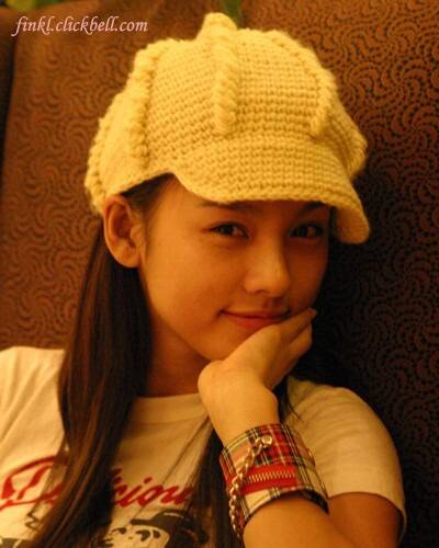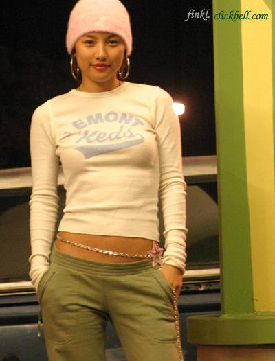 흰색 타이트 티셔츠에 핑크 비니,