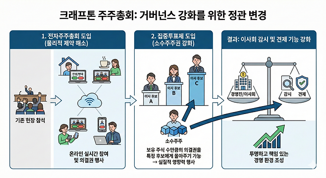 전자주총은 주주가 직접 참석하지 않고도 온라인을 통해 회의를 참관하고 의결권을 행사할 수 있도록 도입한 제도다. 집중투표제는 복수의 이사를 선임할 때 주주가 가진 주식 수만큼 부여된 의결권을 특정 후보 한 명에게 몰아줄 수 있도록 해 소수주주도 이사회 구성에 실질적인 영향력을 행사할 수 있게 한 장치다. 결과적으로 경영진에 대한 견제력을 강화하는 방법을 도입한 것이다.
