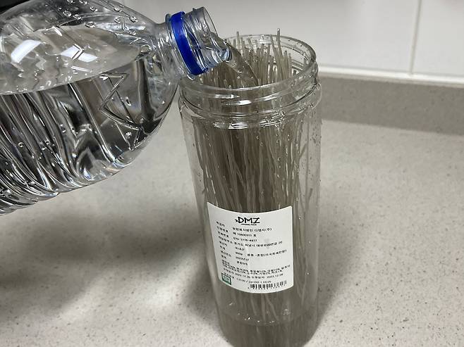 당면 봉지의 윗부분을 가위로 깔끔하게 자른 뒤, 봉지 안에 미지근한 물을 당면이 잠길 정도로 부어주기만 하면 됩니다. 요즘 당면 봉지는 지퍼백이 달려서 나온 경우도 많아 지퍼만 닫아주면 더욱 완벽한 밀폐가 가능합니다. 지퍼를 잠그면 물이 샐 염려가 전혀 없기 때문에 봉지를 그대로 눕혀서 보관할 수 있어, 당면 전체에 수분이 골고루 스며드는 데 매우 유리합니다.