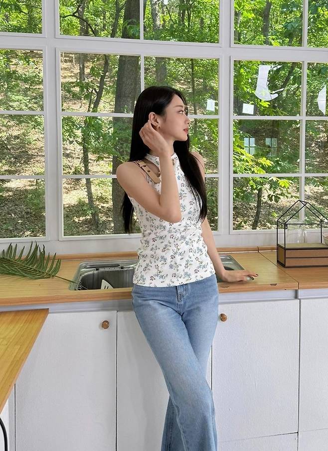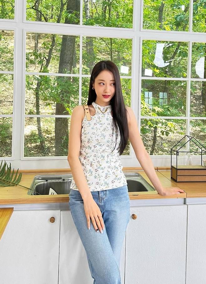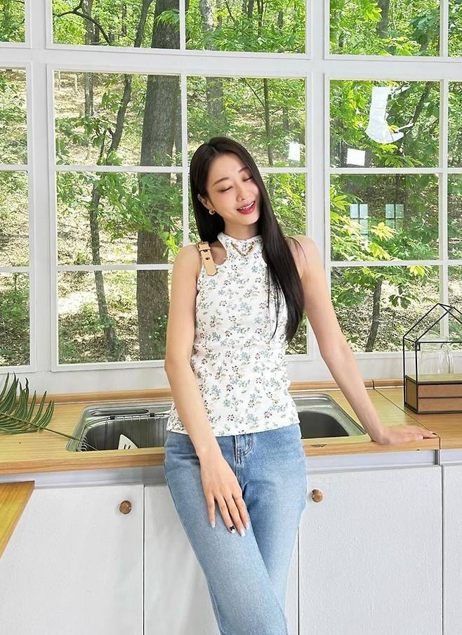 공개한 사진에서 경리는 싱그럽고 화사한 꽃무늬 티셔츠에 데님 팬츠를 매치한 출근룩으로 시선을 사로잡았다.