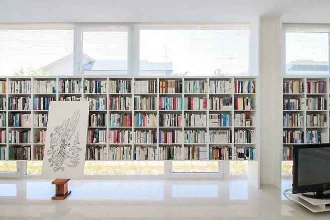 더불어 이 독특한 입면은 실내에도 영향을 주었다. 거실과 서재 상-하부의 길쭉한 창호와 ‘떠 있는 책장’을 통해 외부의 잡다한 풍경과 시선을 걸러내면서 외부와 연장된 공간에 있는 듯한 착각을 불러 일으킨다.