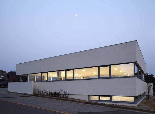 정직하고 강렬한 입면의 흐르는 집 또한 마찬가지이다. 백색의 견고한 면과 단순한 창호 계획이 만들어 낸 정직한 입면은 간헐적으로 노출되는 실내 이면의 공간을 상상하게 한다.