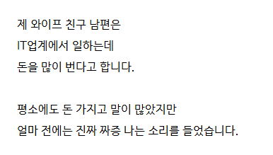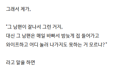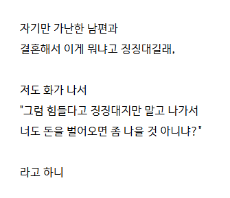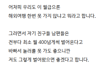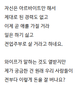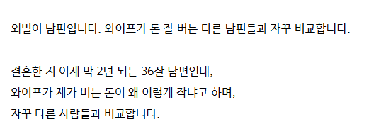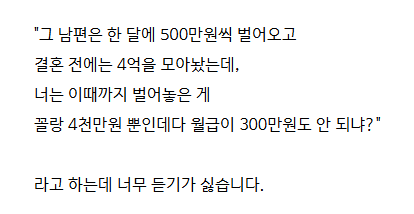 외벌이 남편입니다. 와이프가 돈 잘 버는 다른 남편들과 자꾸 비교합니다.