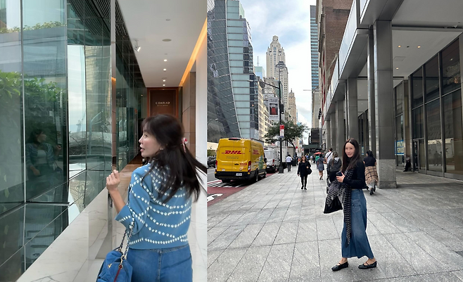 두 번째 사진에서는 뉴욕 거리를 배경으로 체크 패턴 셔츠와 데님 스커트를 매치한 캐주얼 룩을 선보이고 있다. 베이지 톤의 체크 셔츠를 어깨에 걸쳐 레이어드 스타일링을 연출했으며, 로퍼 슈즈로 편안함과 세련됨을 동시에 표현하고 있다.