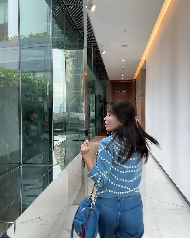 세 번째 사진에서 김정은은 파란색 바탕에 화이트 도트가 프린트된 니트 톱을 착용해 사랑스러운 매력을 발산하고 있다. 데님 팬츠와의 조합으로 캐주얼하면서도 여성스러운 분위기를 연출하며, 작은 체인백으로 포인트를 주어 완성도 높은 스타일링을 보여주고 있다.