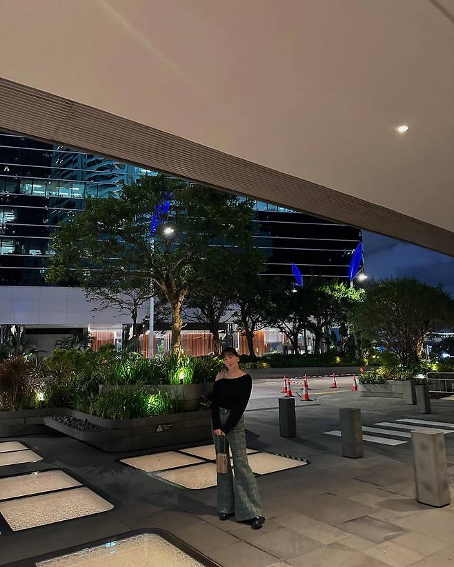 마지막 사진에서는 검은색 원피스로 시크한 올블랙 룩을 연출하고 있다. 심플한 디자인의 원피스에 부츠를 매치해 도시적이고 세련된 분위기를 자아내며, 야경과 어우러져 더욱 드라마틱한 무드를 완성하고 있다.