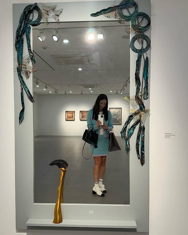 첫 번째 사진에서 김정은은 갤러리 방문 시 민트 컬러 재킷과 스커트로 구성된 세트룩을 연출하고 있다. 깔끔한 라인의 재킷과 미니 스커트의 조합으로 지적이면서도 세련된 분위기를 자아내고 있으며, 검은색 핸드백과 흰색 스니커즈로 캐주얼함을 더해 갤러리라는 공간에 어울리는 모던한 룩을 완성했다.
