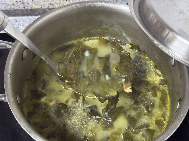 쌀뜨물에는 녹말 성분이 있는데요. 그 성분이 국물에 퍼지면서 미역국 전체의 감칠맛을 폭발시켜줍니다. 그리고 국물이 마치 사골처럼 진하게 우러난 듯한 느낌을 주어 미역국 특유의 밍밍함을 없애고 구수함을 극대화합니다.
