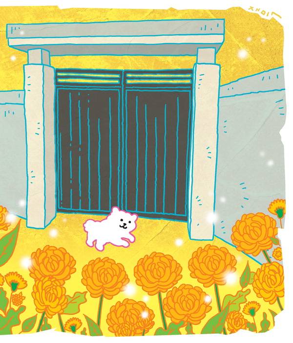 현관문을 열고 나오니, 텃밭이 있던 자리에 노란 야생 국화가 보였어요. 문득 시든 꽃을 정리해주고 싶다는 생각이 들었어요. 순심이는 늘 선생님 발치에서 잠들었는데, 노란 국화 사이에서 자고 있더군요. 마치 엄마 품에 안겨 행복한 꿈을 꾸는 듯한 표정이었어요. 다가가 등을 쓰다듬는데, 따님이 아기를 안고 나왔어요.