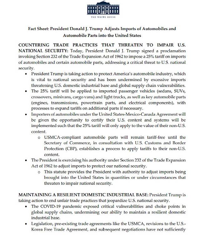 이날 트럼프 대통령이 행정명령에 서명한 후 공개된 백악관 팩트시트에는 “25% 관세는 수입 승용차(세단, SUV, 크로스오버, 미니밴, 화물밴)와 경트럭뿐 아니라, 엔진, 변속기, 파워트레인 부품, 전기 부품 등 주요 자동차 부품에도 적용된다”고 밝혔다. 아울러 “필요 시 추가 부품에도 확대될 수 있다”고 밝혔다.
