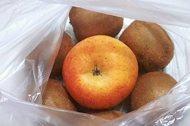 비닐봉지에 키위와 사과를 같이 넣어주시면 된답니다. 그러면 사과가 키위를 빨리 후숙 하게 해 준다고 해요. 감자는 싹을 틔우지 못하게 하는 역할을 하지만 덜 익은 과일은 빨리 후숙 하게 한다는 것이 신기해요.
