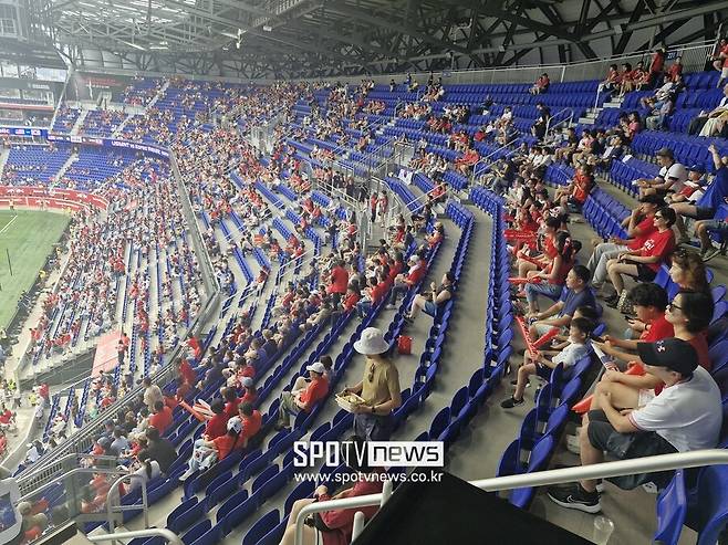 두 팀의 맞대결이 열리는 이곳 스포츠 일러스트레이티드 스타디움은 붉은 물결로 가득하다. 육안으로 봐도 한국의 붉은색 유니폼을 입은 사람들이 다수다. 마치 상암월드컵경기장을 방불케 한다.