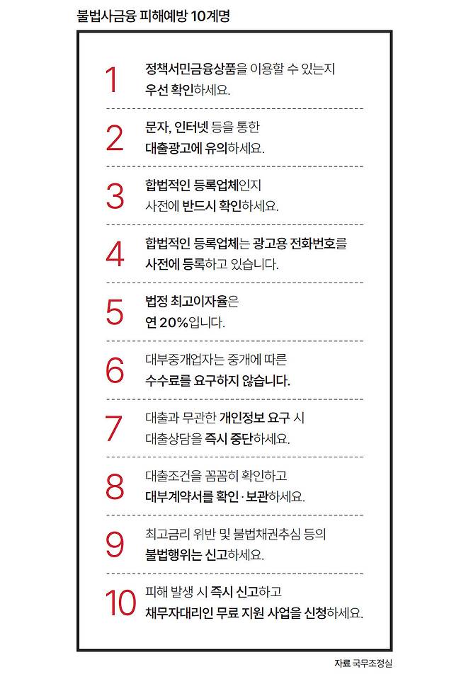 정부는 불법사금융 피해예방책도 논의했습니다. 급전이 필요한 경우라면 제일 먼저 서민금융진흥원(1397)의 정책금융상품을 확인할 것을 당부했습니다. 신용도와 상환능력이 낮은 취약계층도 최소한의 심사만 거치면 소액생계비 대출, 최저신용자특례보증, 햇살론15 등 정책금융상품을 이용할 수 있습니다.