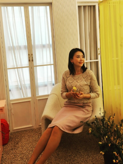 한 여배우가 밝고 포근한 분위기의 실내 공간에서 단아한 니트 스타일링을 선보이며 시선을 사로잡았다.