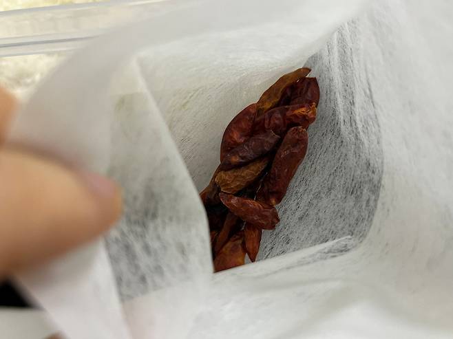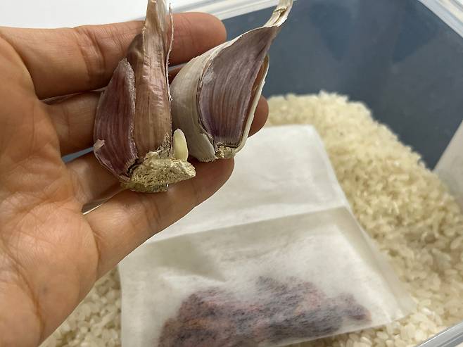 쌀을 소분하기 어려울 때, 쌀통에 고추나 마늘 등 매운 성질의 식재료를 넣어놓는 방법도 있습니다. 저는 고추가 혹시 쌀과 섞일까 봐 다시백에 넣은 후 쌀통에 넣습니다.