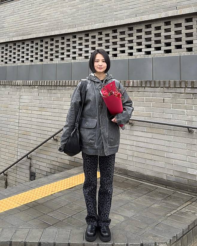 윤승아는 그레이 컬러의 후드 점퍼와 레오파드 패턴 팬츠, 블랙 워커를 매치해 개성 있는 아웃도어 스타일을 선보였다. 크로스백과 꽃다발 소품이 더해져 실용성과 포인트를 동시에 잡은 모습이다.