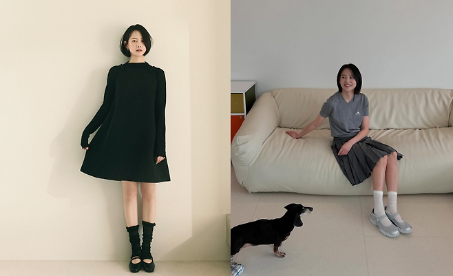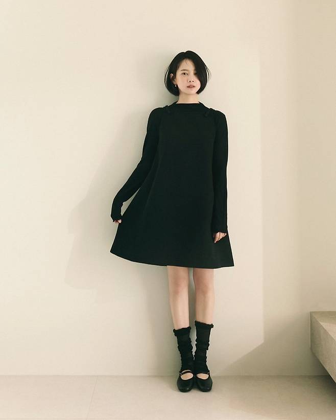 윤승아는 심플한 블랙 미니 원피스에 블랙 메리제인 슈즈와 양말을 매치해 미니멀하면서도 세련된 분위기를 연출했다. 자연스러운 단발 헤어스타일과 군더더기 없는 액세서리 선택이 전체적으로 단정하면서도 시크한 이미지를 완성한다.