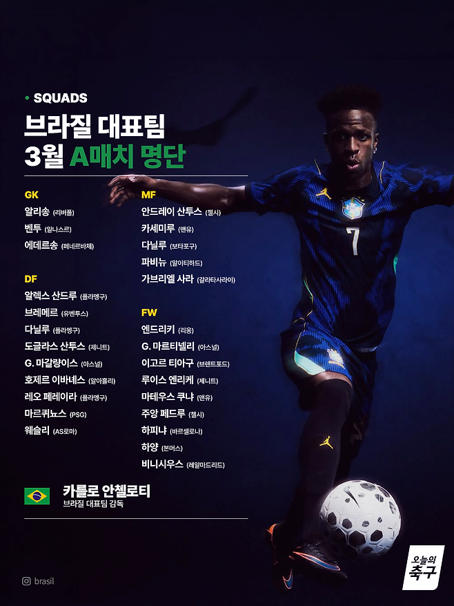 브라질 대표팀은 3월 A매치를 앞두고 명단을 발표했고, 이번에도 네이마르를 제외했다. 카를로 안첼로티 감독이 밝힌 이유는 그의 체력이 100%가 아니라는 것. 그러나 네이마르의 반월판 부상 회복과 최근 활약, 호드리구의 장기 부상 등을 고려할 때 단순히 체력이나 컨디션 문제만이라 보긴 어렵다. 오히려 네이마르의 주 포지션인 왼쪽 측면에 비니시우스와 하피냐, 마르티넬리 등 자원이 풍부하다는 것이 주된 이유일 가능성이 크다. 그리고 이는 동시에 네이마르가 2026 북중미월드컵에 제외될 것이라는 사실을 암시한다.