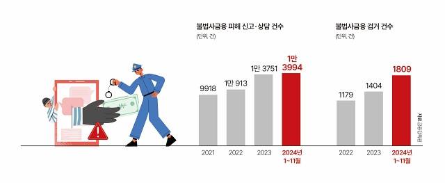 법정 최고금리 20%를 훨씬 초과하는 고금리, 악질적인 불법채권추심 등 불법사금융 피해가 해가 갈수록 늘어나고 있습니다. 금융감독원에 따르면 2024년 1월부터 11월까지 접수된 불법사금융 피해신고·상담 건수는 1만 3994건으로 2023년 1월부터 11월까지 접수된 1만 2520건에 비해 11.8% 증가했습니다. 정부는 불법사금융 이용자 수가 2023년 81만 명을 넘었을 것으로 추정하고 있습니다.