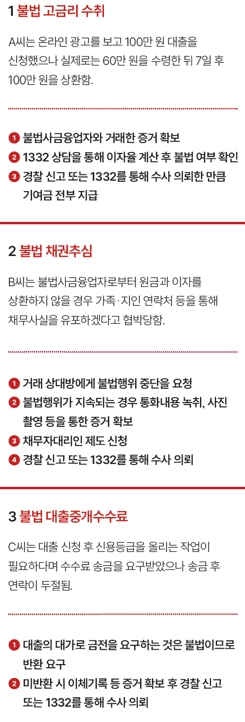 불법사금융 피해가 발생했을 때 즉시 도움을 요청할 수 있는 통로도 있습니다. 금감원이 운영하는 불법사금융 피해신고센터(1332)로 전화하면 종합적인 안내를 받을 수 있습니다.