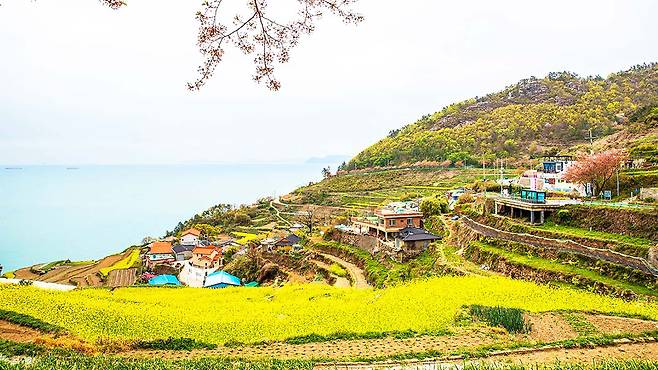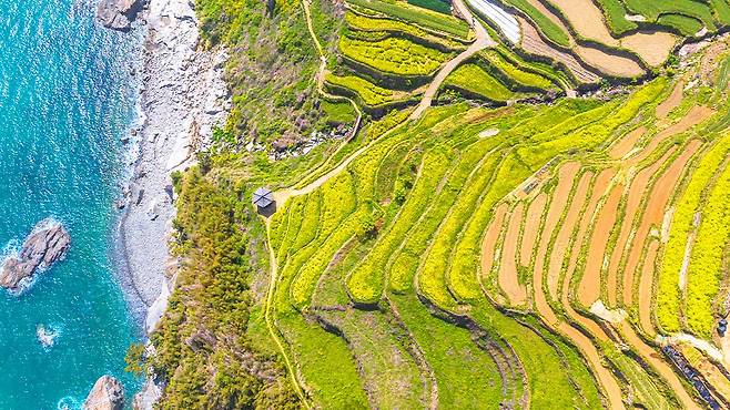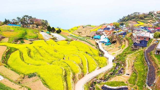 마을 높은 곳에서 내려다보는 풍경은 마치 초록색 파도가 바다를 향해 굽이쳐 내려가는 듯한 착각을 불러일으킵니다. 특히 3월 말부터 4월 사이에는 다랭이 논 사이사이로 노란 유채꽃이 만개하여 푸른 남해 바다와 강렬한 색채 대비를 이룹니다.