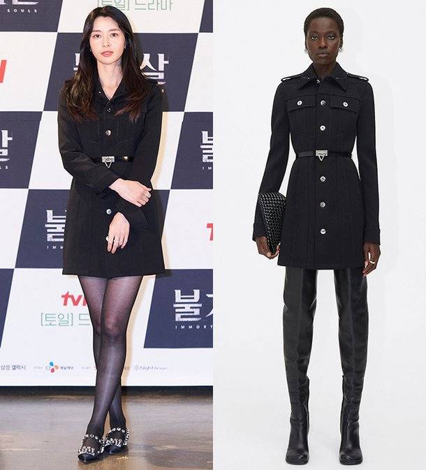공개된 사진 속 권나라는 블랙 컬러의 플리츠 원피스에 베이지 트렌치코트를 매치했다. 심플한 디자인의 원피스지만 정교한 플리츠 주름 디테일이 고급스러운 분위기를 자아냈다.