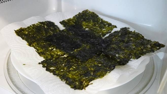 그리고 10~15초 정도만 돌려주면 다시 바삭한 김을 드실 수 있어 좋답니다. 전자레인지가 수분을 뺏고 그 수분을 키친타월이 흡수해 더욱 바삭해져 맛이 좋아요.