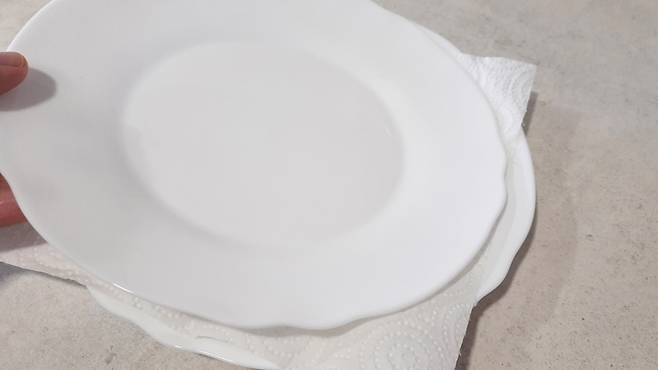 이럴 땐 접시나 그릇 중간중간에 키친타월을 조금 잘라 끼워 넣기만 하면 됩니다. 이렇게 하면 서로 닿는 부분에 키친타월이 있어 더욱 안전하게 보관할 수 있어요.