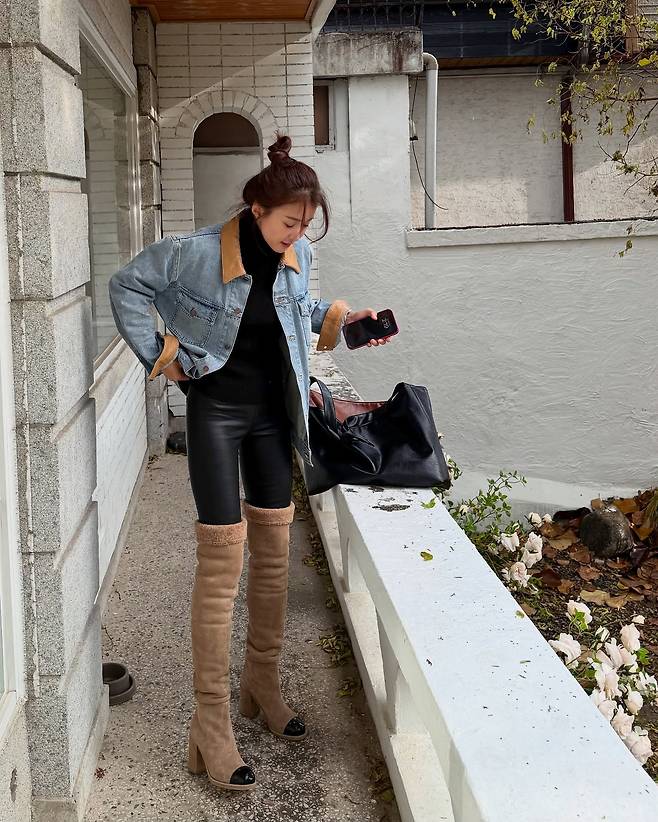 라이트 워싱의 데님 재킷에 브라운 카라 디테일을 더해 클래식한 무드를 자아내고 있다. 블랙 터틀넥과 레깅스로 슬림한 실루엣을 강조하였으며, 브라운 롱부츠로 세련된 가을/겨울 스타일을 선보이고 있다.