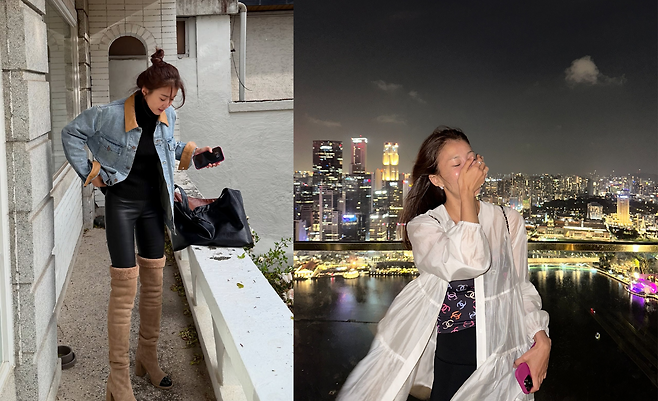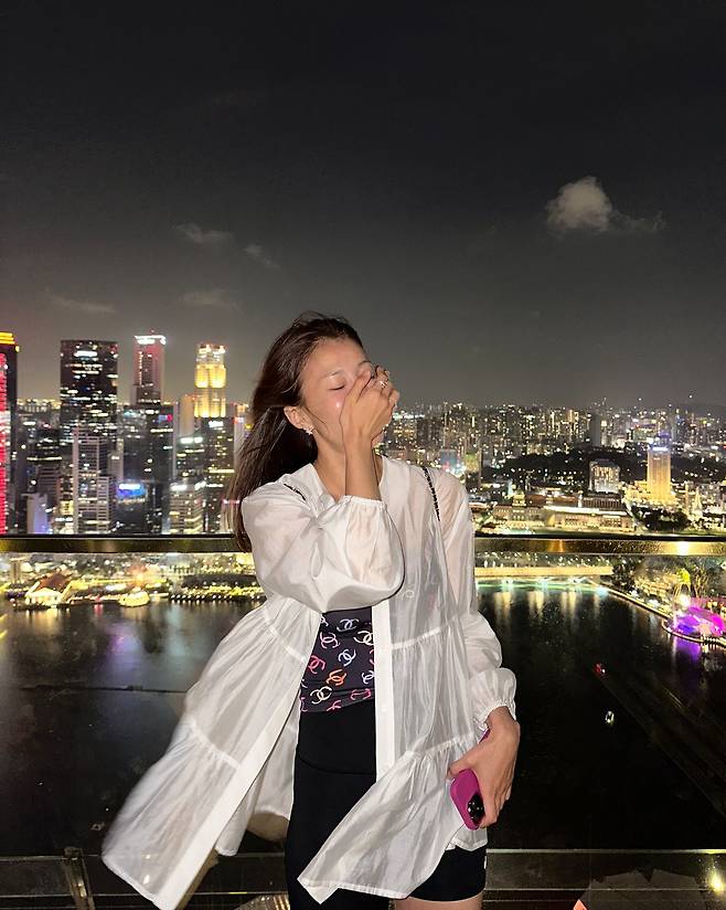 화이트 티어드 셔츠 드레스로 여성스러운 실루엣을 강조하고 있다. 블랙 쇼츠와 매치해 단정하면서도 스타일리시한 룩을 연출했으며, 싱가포르의 야경을 배경으로 로맨틱한 무드를 자아내고 있다.