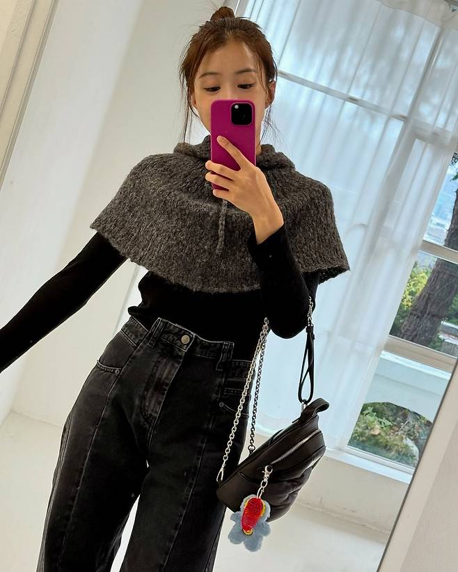 그레이 케이프와 블랙 터틀넥의 조화로 시크한 분위기를 자아내고 있다. 블랙 하이웨이스트 데님과 체인 디테일의 미니백으로 도시적인 감각을 더했으며, 미니멀한 스타일링으로 세련된 데일리룩을 완성했다