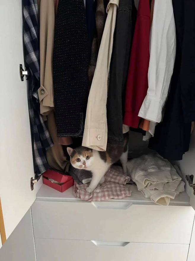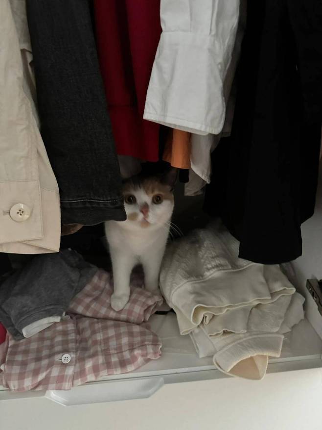 안심한 여성은 집 안을 꼼꼼히 수색하기 시작했습니다. 고양이가 평소에 즐겨 숨어들던 모든 서랍장과 문을 샅샅이 열어보았습니다. 마침내 어떤 옷장 문을 열자, 그 안에서 고양이 한 마리가 조심스럽게 고개를 내밀었습니다.