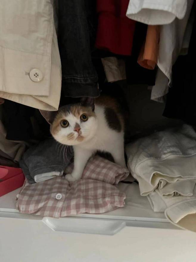 안심한 여성은 집 안을 꼼꼼히 수색하기 시작했습니다. 고양이가 평소에 즐겨 숨어들던 모든 서랍장과 문을 샅샅이 열어보았습니다. 마침내 어떤 옷장 문을 열자, 그 안에서 고양이 한 마리가 조심스럽게 고개를 내밀었습니다.