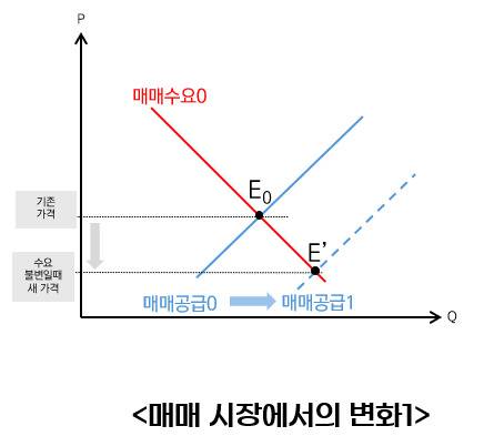 아래 그래프에서, 매매 공급 0에서 매매 공급 1로 공급이 늘어나면, 기존의 E0 보다 가격이 낮아진 곳에 새로운 균형점 E’이 생긴다는 개념입니다.