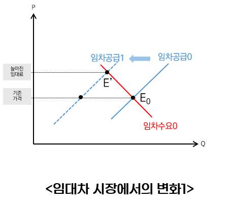 이 주장을 수요-공급 그래프에서 보면 아래의 임차 공급 0에서 임차 공급 1로 공급 곡선이 왼쪽으로 이동하는 경우입니다.
