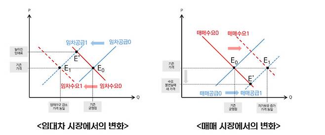 수요 공급 곡선으로 보자면 다음과 같습니다. 공급 곡선이 왼쪽으로 이동한 만큼 (임차 공급 1← 임차 공급 0) 수요곡선도 왼쪽의 점선으로 이동해서 (임차 수요 1← 임차 수요 0) 균형이 유지된다는 것이지요. 균형점이 (수요가 불변일 때의 E’가 아니라) E1으로 간다는 겁니다. 총량적으로는 균형이 유지되니 집이 모자라거나 가격이 비싸질 걱정은 할 필요가 없다는 논리입니다.